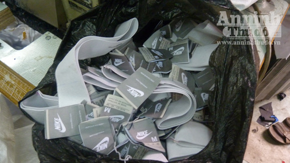 Tại đây, lực lượng chức năng đã phát hiện hàng trăm bộ quần áo thể thao nghi giả nhãn hiệu Nike (sản xuất tại Việt Nam). Đặc biệt, tổ kiểm tra còn thu giữ một số lượng lớn tem nhãn hiệu Nike được sản xuất gia công.