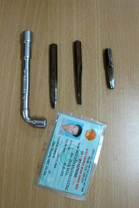 Nguyễn Khánh Cường, 40 tuổi, trú tại Hai Bà Trưng, Hà Nội bị CAP Phương Mai, Đống Đa, HN, bắt quả tang đang có hành vi tàng trữ ma túy trong người. Tuy nhiên, cơ quan công an còn phát hiện trong túi quần Cường có một tay công và 3 đầu vam phá khóa điện xe máy.