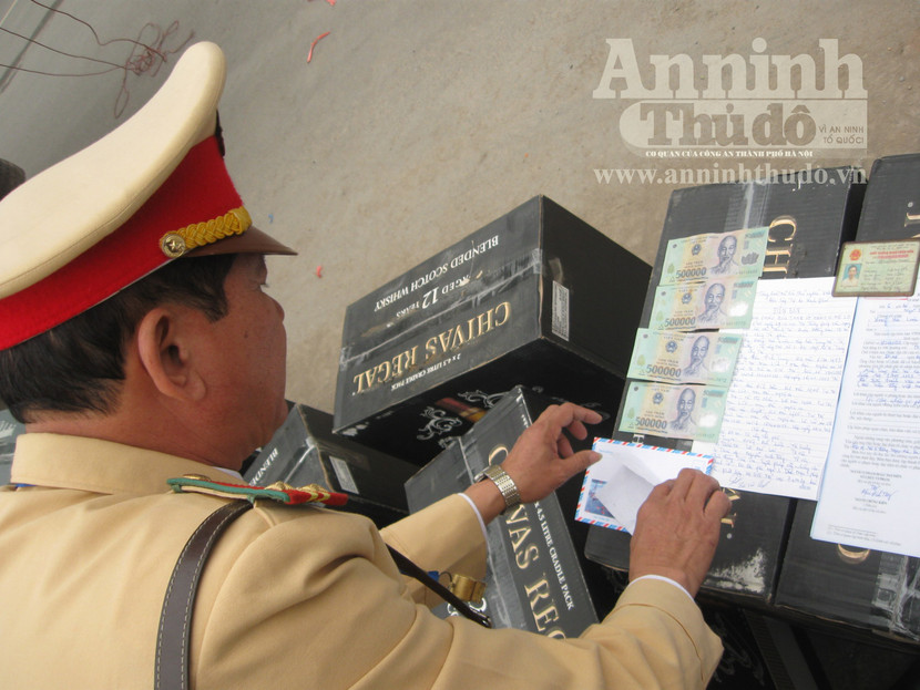 Lái xe tải trên là Trần Văn Quyết (SN 1985) ở Phú Thọ đã không xuất trình được bất cứ loại giấy tờ nào chứng minh nguồn gốc xuất xứ hợp pháp của số rượu ngoại trên. CSGT kiên quyết lập biên bản xử lý vi phạm. Trong quá trình tổ công tác lập biên bản, sau khi xin bằng miệng không được, phụ xe tải là Đậu Đình Trung (SN 1973) ở Nghệ An đã hối lộ tổ công tác 2 triệu đồng để…CSGT cho qua.