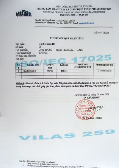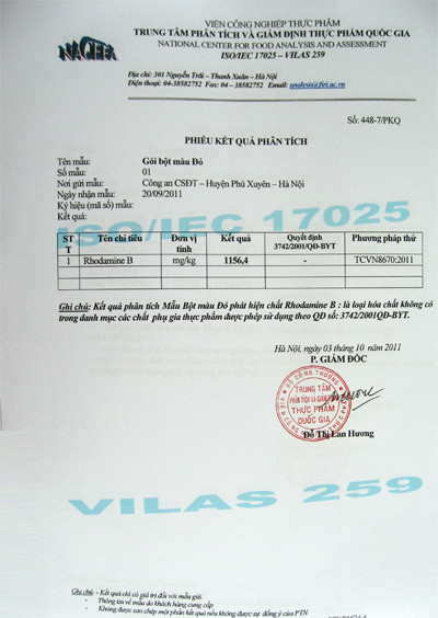 Kết quả phân tích đến nay cho thấy, 6 mẫu tương ớt đều có Rhodamine B. Mẫu có hàm lượng Rhodamine B cao nhất là 14,03mg/kg. Hai gói bột màu đỏ và tím thu giữ tại xưởng là Rhodamine B - chất nhuộm vải công nghiệp, không có trong danh mục các chất phụ gia thực phẩm được phép sử dụng tại Việt Nam. Làm việc với cơ quan công an, bà Bùi Thị Chung - vợ ông Đình khai nhận: Rhodamine B được bà mua tại một hàng bán bột màu trên phố Hàng Gà, quận Hoàn Kiếm, với giá 18.000 đồng/100gam. Việc “đầu độc” người tiêu dùng được cơ sở lén lút thực hiện từ đầu năm 2010 đến nay. Theo bà Chung, để tăng độ đỏ, đẹp cho sản phẩm, ngoài chất bảo quản, cứ 50 lít tương ớt bà cho thêm 4 thìa Rhodamine B và 5 thìa bột màu vàng (chưa xác định). Tương ớt thành phẩm chứa chất gây ung thư được cơ sở nhà ông Đình bán công khai tại nhà, và giao cho nhiều cửa hàng ăn tại TP Hà Nội, tỉnh Hà Nam.