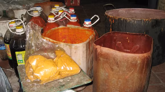Như Báo ANTĐ đưa tin, ngày 18-9, Đội 4 Phòng Cảnh sát PCTP về môi trường - CATP Hà Nội, phối hợp với CAH Phú Xuyên, kiểm tra việc chấp hành quy định về VSATTP trong chế biến, sản xuất tương ớt, tại cơ sở nhà ông Dương Văn Đình (SN 1965), ở Tiểu khu Phú Mỹ, thị trấn Phú Xuyên phát hiện hàng trăm lít tương ớt thành phẩm, được đóng can chờ tiêu thụ.