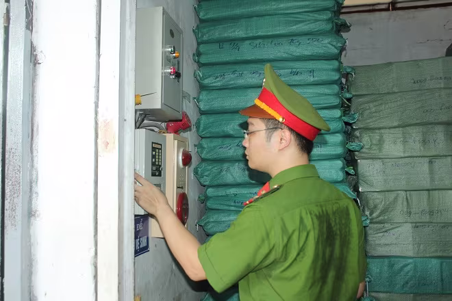Lực lượng chức năng tiến hành kiểm tra an toàn PCCC khu kho xưởng của công ty TNHH Quang Quân