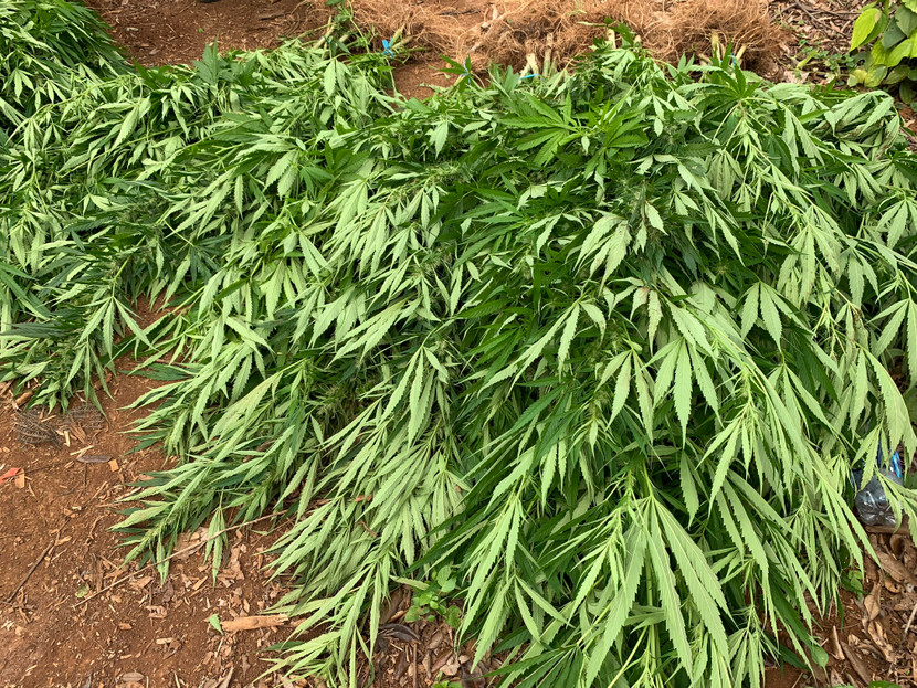 Cơ quan công an tiến hành nhổ bỏ số cần sa được trồng trong rẫy cà phê.