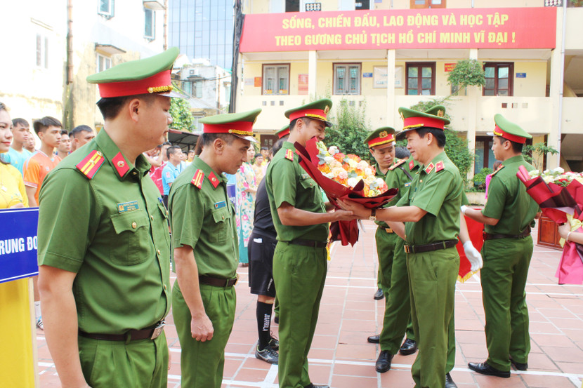| Thiếu tướng Lê Văn Sao, Phó Tư lệnh Bộ Tư lệnh Cảnh sát cơ động; Đại tá Phan Công Huế, Trung đoàn Trưởng Trung đoàn Cảnh sát bảo vệ mục tiêu chính trị, kinh tế, văn hóa - xã hội, khoa học kỹ thuật tặng hoa và cờ cho các đơn vị tham gia Đại hội khỏe |