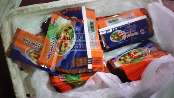Hàng ngàn gói bột canh i-ot mang nhãn hiệu Hải Châu và hàng trăm gói mì chính nhãn hiệu Ajinomoto giả được cơ quan công an phát hiện trước khi đưa đi tiêu thụ