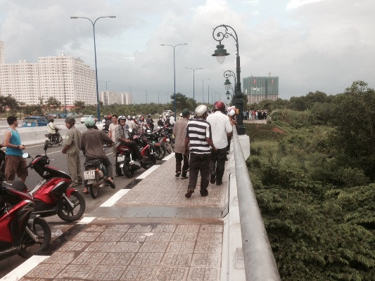 Chiều 14/7, một người bán háng rong ven đường Mai Chí Thọ, đoạn thuộc phường Bình Khánh, quận 2, TP.HCM hốt hoảng khi phát hiện chân người trong bụi rậm dưới chân cầu Cá Trê lớn trong lúc đi vệ sinh.
