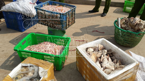 Tổ công tác đã ra hiệu lệnh dừng xe ô tô tải chở hàng trên để kiểm tra thì phát hiện trên xe chở nhiều thùng xốp chứa nội tạng động vật đang trong quá trình phân hủy. Qua kiểm đếm, số hàng gồm 218 kg tai lợn và hơn 100 kg lòng lợn.