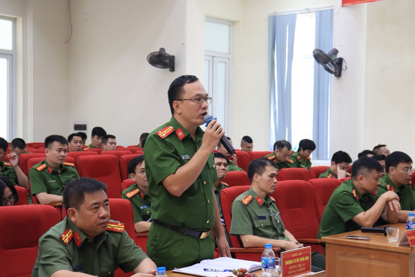 Thượng tá Vũ Tuấn Anh – Bí thư Đảng ủy, Trưởng Công an phường Nghĩa Đô phát biểu tại buổi làm việc.