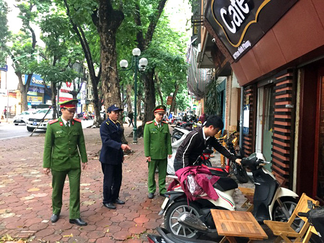 Công an phường Quán Thánh, quận Ba Đình tuần tra, nhắc nhở các hộ kinh doanh không vi phạm TTĐT, TTATGT, VSMT
