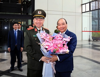 Thủ tướng Chính phủ Nguyễn Xuân Phúc nhận bó hoa chúc mừng của Đại tướng Tô Lâm, Ủy viên Bộ Chính trị, Bí thư Đảng ủy Công an Trung ương, Bộ trưởng Bộ Công an thay mặt các tướng lĩnh, sỹ quan, chiến sỹ trong lực lượng CAND