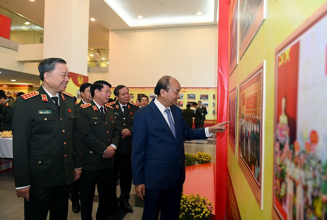 Thủ tướng Nguyễn Xuân Phúc và các đồng chí lãnh đạo Bộ Công an xem triển lãm hình ảnh về hoạt động của lực lượng CAND được trưng bày trong khuôn khổ Hội nghị