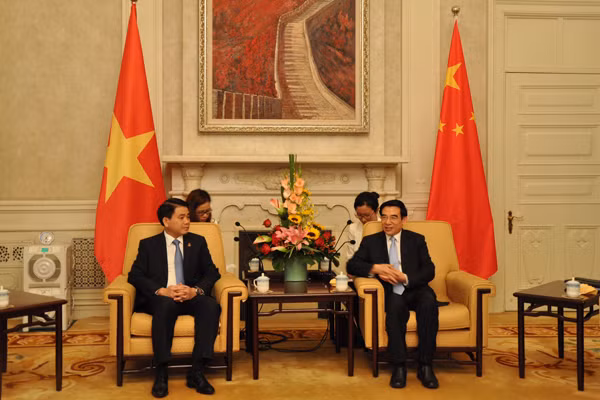 Chủ tịch UBND Thành phố Hà Nội Nguyễn Đức Chung (bên trái) gặp và làm việc với Thị trưởng Bắc Kinh Vương An Thuận