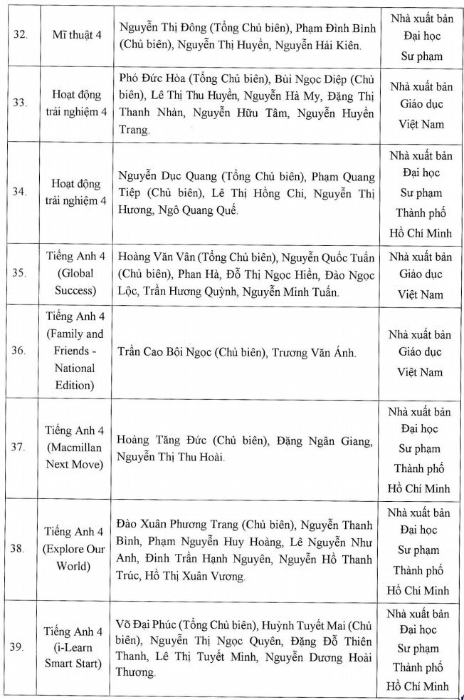 Danh mục sách giáo khoa lớp 4 đã được Bộ GGD-ĐT phê duyệt như sau: