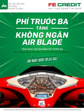 Cụ thể, mỗi khách hàng đăng ký vay và được duyệt thành công với FE CREDIT khi mua xe máy dòng Honda Air Blade sẽ được doanh nghiệp hỗ trợ một phần phí trước bạ tương đương 250.000 đồng/khách hàng. Chương trình khuyến mại được áp dụng cho 2.000 khách hàng đầu tiên đủ điều kiện vay mua và được duyệt vay thành công trong thời gian áp dụng chương trình.