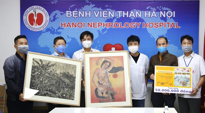 Đại diện Báo An ninh Thủ đô, Công ty Indochine Art trao tặng 50 triệu đồng cùng 2 tác phẩm nghệ thuật cho Bệnh viện Thận Hà Nội, sáng 27-4. Ảnh: Thuần Thư
