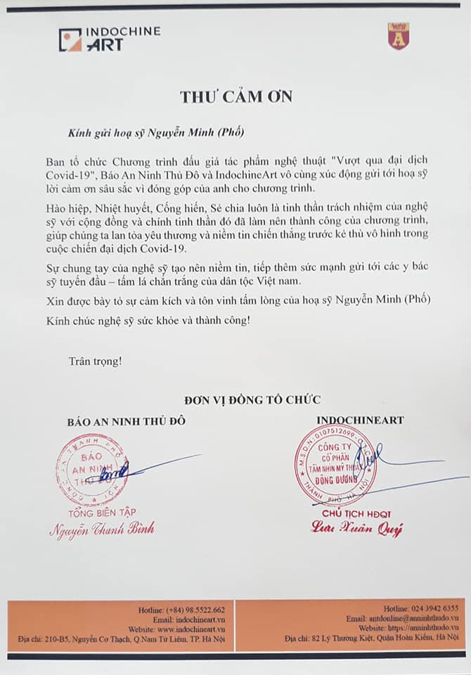 Chưa hết, sau 6 phiên đấu giá, Ban Tổ chức đã in Thư cảm ơn và Giấy Chứng nhận bản quyền tác phẩm một cách đầy trân trọng gửi tới các họa sĩ và nhà sưu tầm đã nhiệt tâm tham gia chương trình. Họa sĩ Nguyễn Minh đã phải thốt lên, “Tôi từng tham gia nhiều phiên đấu giá nghệ thuật, ủng hộ có, đấu giá thông thường có nhưng lần này, còn nhận được Thư cảm ơn có chữ ký của lãnh đạo 2 đơn vị đồng chức. Cảm ơn BTC đã làm việc chuyên nghiệp và chu đáo”.