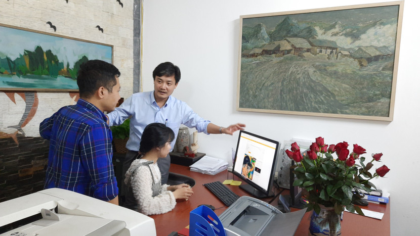Ông Lưu Xuân Quý, Chủ tịch HĐQT Indochineart trao đổi cùng Phó Tổng biên tập Báo An ninh Thủ đô Chu Quốc Dũng, về công tác chuẩn bị của phiên đấu giá đầu tiên trước khi khai sàn.