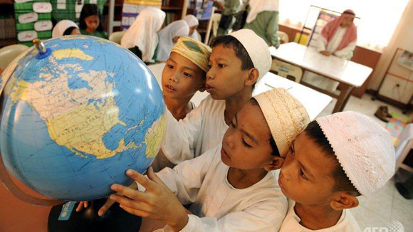 Học sinh với mô hình quả địa cầu tại trường Tiểu học Baseco