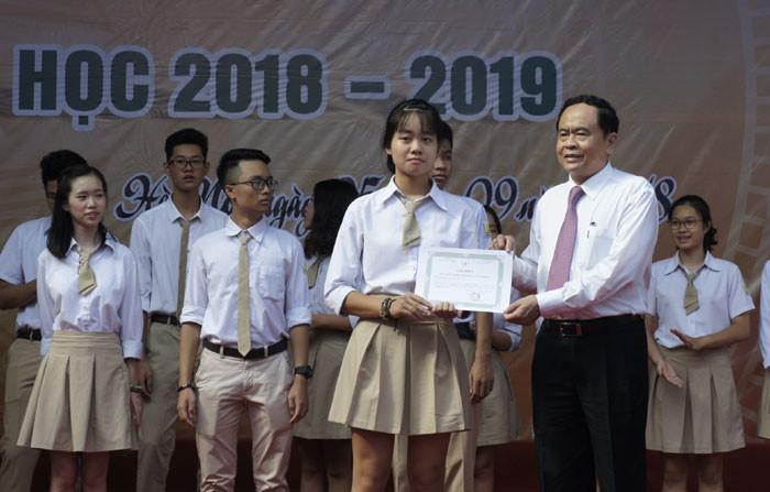 Chủ tịch Ủy ban Trung ương MTTQ Việt Nam Trần Thanh Mẫn trao phần thưởng học sinh xuất sắc và học bổng Phan Huy Chú cho học sinh nhà trường