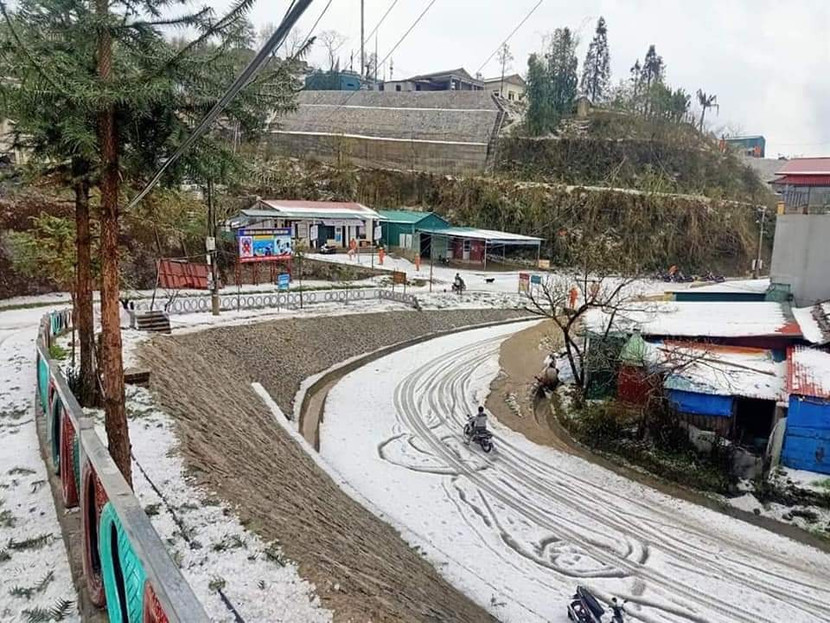 Trong khi đó, sáng nay, mưa đá ở vùng cao nguyên Dào San, Phong Thổ, Lai Châu phủ trắng núi đồi, làng bản