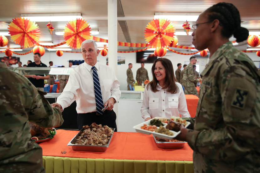 Tại căn cứ Al Assad, ông Pence và vợ đã cùng nhau phục vụ bữa ăn theo Ngày Tạ ơn truyền thống cho khoảng 700 lính. Trong chuyến công du đầu tiên của mình tới Iraq trên cương vị Phó Tổng thống Mỹ, ông Pence đã không đến thăm Baghdad vì quan ngại an ninh liên quan tới biểu tình.