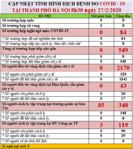 Theo thông tin cập nhật từ hệ thống giám sát dịch bệnh của Sở Y tế Hà Nội, tính đến 8h30 sáng nay, 27-2, toàn bộ 84 mẫu xét nghiệm các trường hợp nghi mắc viêm phổi cấp do chủng mới của virus corona (Covid-19) trên địa bàn thành phố đều đã âm tính.