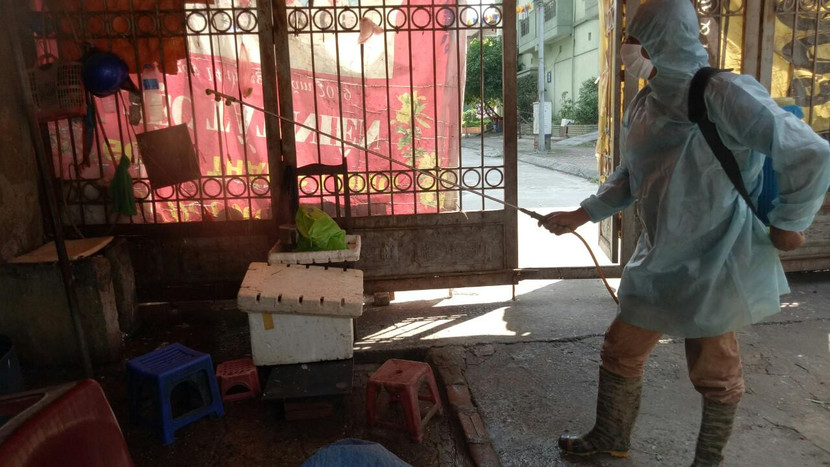 Nhân viên y tế phun khử khuẩn tại chợ Diêm Gỗ, phường Đức Giang