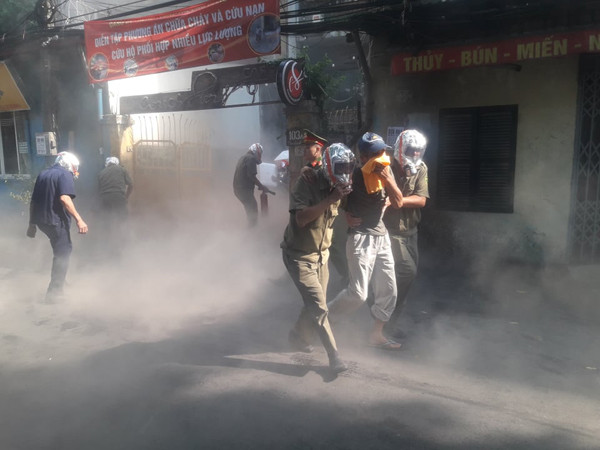 Lúc này, lực lượng CAP Giảng Võ đã nhanh chóng có mặt, cùng dân quân tự vệ, dân phòng đeo mặt nạ phòng độc vào cứu người, cứu tài sản, thực hiện chữa cháy ban đầu.