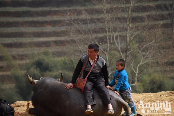 Giàng A Cháng hôm nay cũng được theo bố xuống chợ bán trâu...