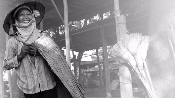 Cụ Nguyễn Thị Thêu (75 tuổi, mẹ đẻ chị Thuận) đang khâu áo tơi. Áo khâu từ lá nón, căng 9 dây ngang lên khung rồi vắt từng mảnh lá lên để khâu, cụ phải mất 3 giờ để hoàn thành chiếc áo.