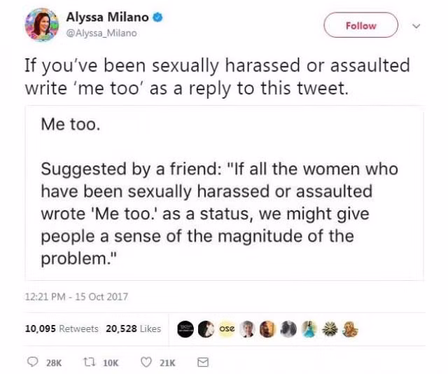 ANTD.VN - Được bắt nguồn từ 1 hashtag sử dụng trên Twitter, #Metoo nhanh chóng nhận được sự hưởng ứng của nhiều người, trong đó có cả những ngôi sao tên tuổi, trở thành cụm từ quyền lực lay chuyển cả thế giới trước vấn nạn tấn công tình dục.