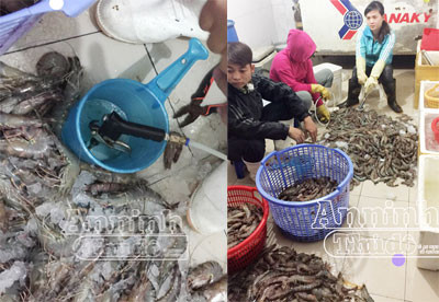 Nhân viên cửa hàng đang bơm tạp chất vào tôm sú chết.