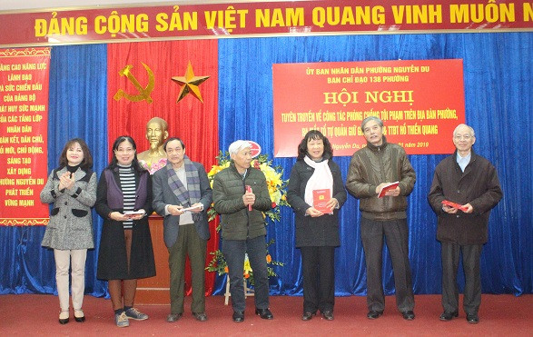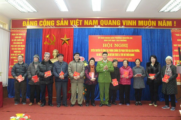 Trung tá Nguyễn Ngọc Tùng, Đội trưởng Đội Cảnh sát hình sự CAQ Hai Bà Trưng tặng sổ tay cho đại diện tổ dân phố