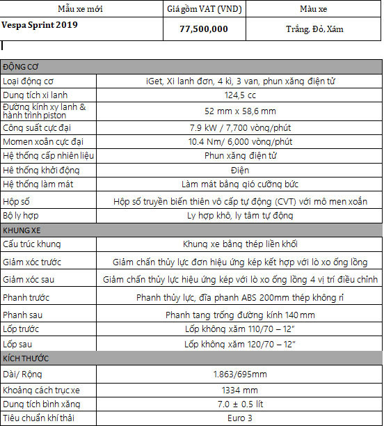 Vespa Sprint 2019 tích hợp đầy đủ các công nghệ tiên tiến như động cơ I-get, hệ thống chống bó cứng phanh ABS cho bánh trước, hệ thống khóa từ chống trộm, cổng USB sạc điện thoại tiện lợi. Vespa Sprint 2019 sở hữu động cơ I-get 125cc tân tiến: xy lanh đơn, làm mát bằng gió, động cơ 4 thì được trang bị hệ thống phun xăng điện tử, 3 van.
