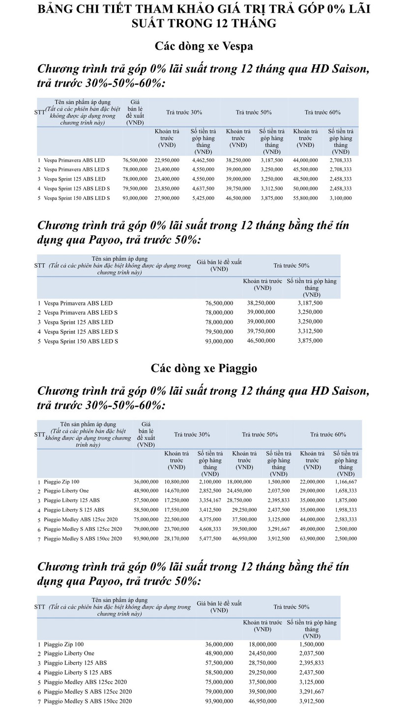 Song song với chương trình khuyễn mãi này, Piaggio Việt Nam vẫn tiếp tục chương trình ưu đãi mua xe theo hình thức trả góp 0% lãi suất qua HD Saison hoặc qua Payoo bằng thẻ tín dụng, đem lại cho khách hàng đa dạng lựa chọn hình thức thanh toán.