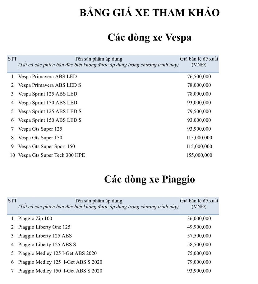 Sản phẩm áp dụng: Tất cả các dòng xe Piaggio và Vespa (trừ Piaggio Liberty 50, Piaggio Zip100 và các phiên bản đặc biệt). Phạm vi áp dụng: Toàn quốc