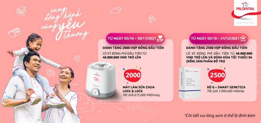 Trải qua 22 năm phát triển tại thị trường Việt Nam, với mong muốn tri ân sự ủng hộ từ khách hàng, Prudential triển khai chương trình khuyến mại “Cùng đồng hành – Cùng yêu thương” dành cho khách hàng cá nhân sở hữu hợp đồng bảo hiểm hợp lệ trong thời gian của chương trình, được phát hành qua 7 ngân hàng đối tác của Prudential trên toàn quốc, bao gồm Ngân hàng TMCP Hàng hải Việt Nam (“MSB”), Ngân hàng TNHH MTV Shinhan Việt Nam (“SHI”), Ngân hàng TMCP Đại chúng Việt Nam (“PVB”), Ngân hàng TMCP Đông Nam Á (“SEA”), Ngân hàng TMCP Quốc tế Việt Nam (“VIB”), Ngân hàng TNHH MTV United Overseas (Việt Nam) (“UOB”), Ngân hàng TNHH MTV Standard Chartered (Việt Nam) (“SCB”), trong thời gian từ ngày 05/10 đến hết ngày 31/12/2021.