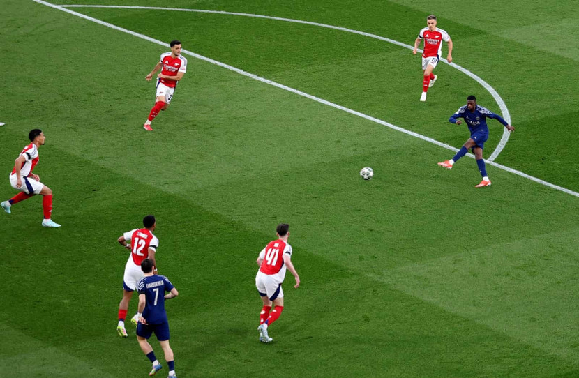 Khi trận đấu mới trôi qua 4 phút, PSG đã khiến sân Emirates chết lặng bằng một pha bóng đẳng cấp. Toàn đội thực hiện tới 26 đường chuyền liên tiếp, kéo giãn hàng phòng ngự Arsenal trước khi bóng đến chân Ousmane Dembele. Trong tư thế khá trống trải, tiền vệ người Pháp tung cú vô lê trái phá khiến David Raya không kịp trở tay.