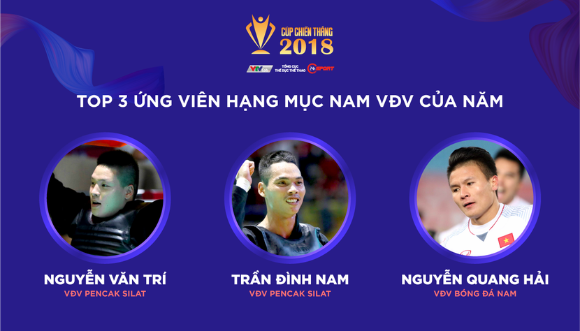 "Nam VĐV của năm" đang là cuộc đua thú vị, giữa một đại diện đến từ bóng đá là tiền vệ Nguyễn Quang Hải (Quả bóng vàng Việt Nam, HCB U23 châu Á, hạng tư ASIAD, HCV AFF Cup) với 2 võ sỹ pencak silat vô địch ASIAD là Trần Đình Nam và Nguyễn Văn Trí.