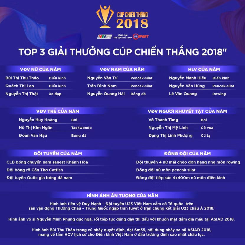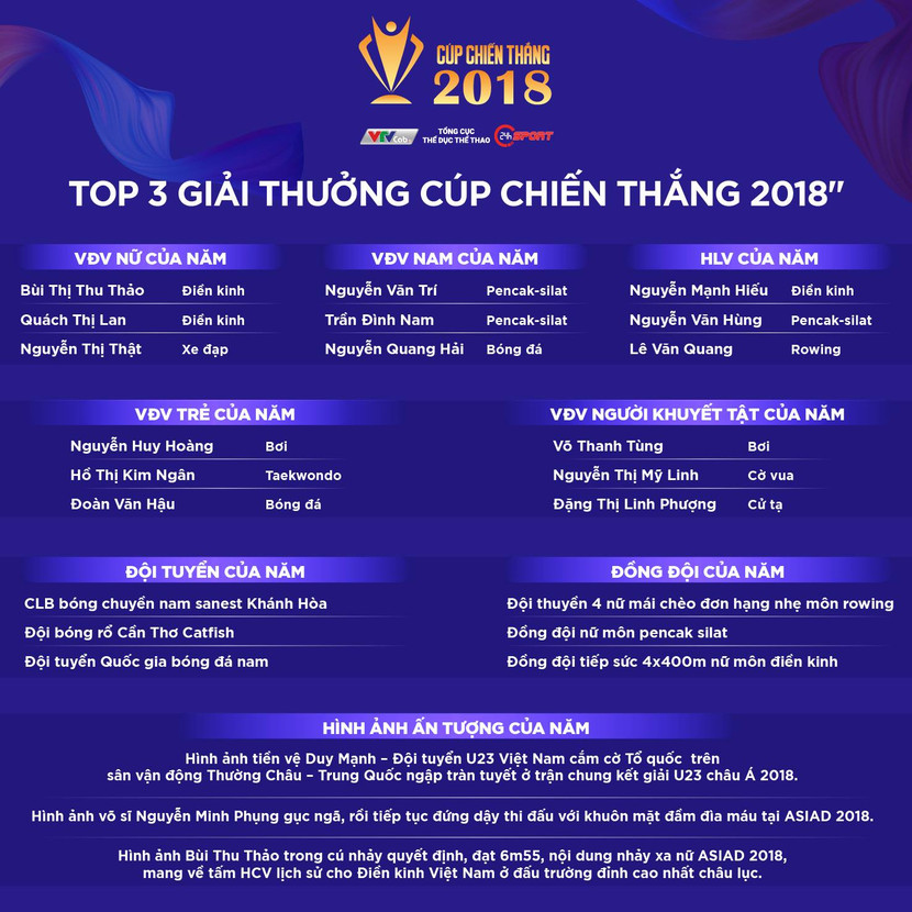 Danh sách đề cử rút gọn các hạng mục giải thưởng Cúp chiến thắng 2018
