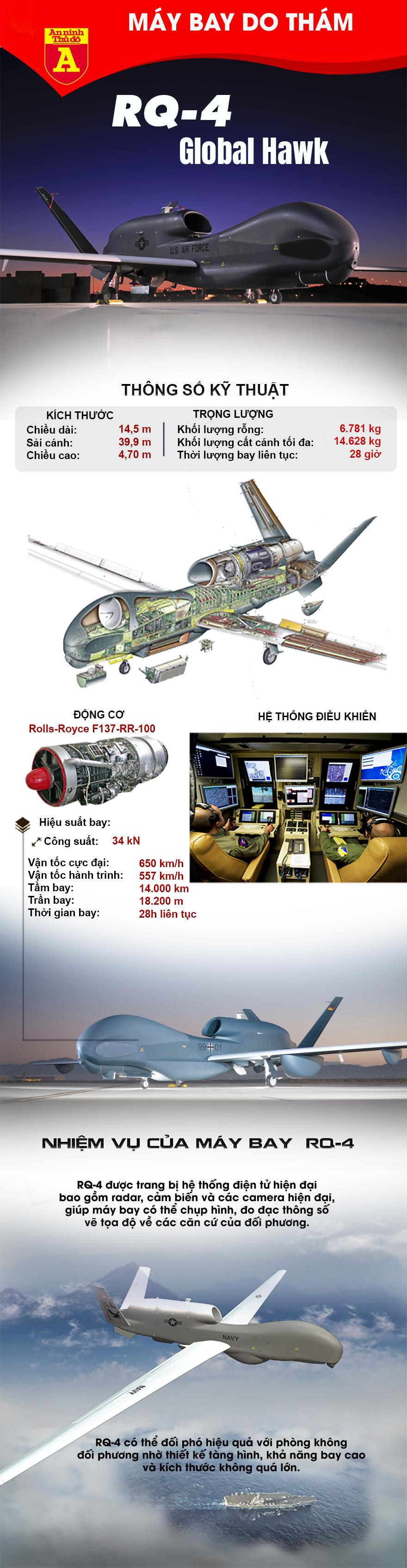 So với máy bay U-2, máy bay do thám RQ-4 Global Hawk không cần người điều khiển trực tiếp, nó có thể lửng lơ trên bầu trời của đối phương hàng ngày liền trước khi phải trở về căn cứ để tiếp nhiên liệu. Với trần bay trên 18km, việc đánh chặn loại máy bay này hết sức khó khăn.