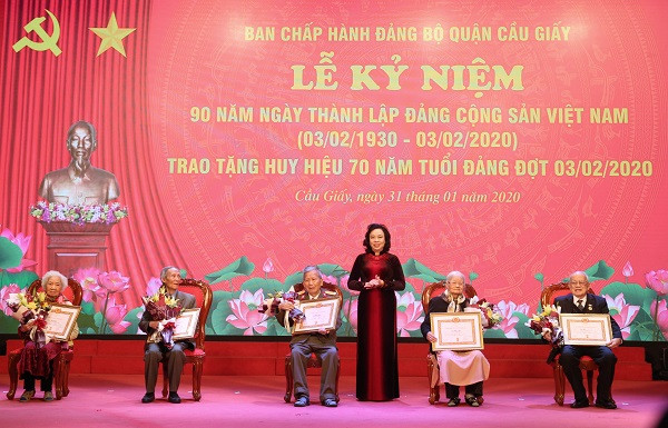 Sáng nay, 31-1, Ban chấp hành Đảng bộ quận Cầu Giấy đã tổ chức Lễ kỷ niệm 90 năm Ngày thành lập Đảng Cộng sản Việt Nam (3/2/1930 - 3/2/2020) và trao tặng Huy hiệu 70 năm tuổi Đảng cho các đảng viên lão thành.