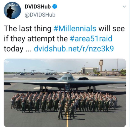 Đoạn tweet này được đăng tải vào hôm 20-9 bởi Cơ quan phân phối Thông tin quốc phòng Mỹ (DVIDS) nhằm cảnh báo phong trào của những bạn trẻ về việc đột nhập vào căn cứ quân sự 51, vốn bị đồn đoán có chứa đựng nhiều bí mật của chính phủ về người ngoài hành tinh và tàu không gian.