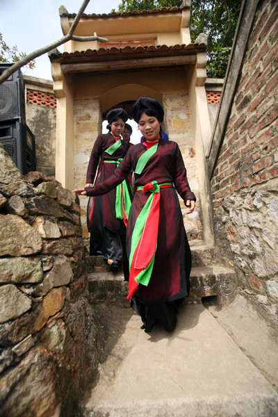 Người đã thế, cảnh sắc càng hiu hắt hơn. Không thấy phất phơ tre pheo bên lũy tre làng. Cũng chẳng giếng khơi hay ao bán nguyệt phủ bèo hoa dâu cho gái trai khỏa trăng long lanh đáy nước. Duy nhất để nhớ về nơi này là khúc sông sát ven làng có cây đa cổ thụ tỏa bóng trăm năm trùm mát mái đình, cong cong mũi hài. Đầu đường đất dẫn vào làng là những bậc đá dẫn xuống sát mép nước. Những phiến đá đen tuyền, rộng cỡ tấm phản, manh chiếu đã mòn dấu chân người làng và khách thập phương. Bất cứ đi đâu về, trước khi bước vào làng không ai bảo ai, từ đứa trẻ tới cụ già thất thập đều bước xuống bậc đá khỏa chân. Như là để rũ sạch bùn đất, bụi bặm thiên hạ. Theo chân mấy cô gái quan họ, tôi rón rén lần theo bậc đá, vốc nước sông vã lên mặt cho trôi đi mồ hôi cùng mệt mỏi.