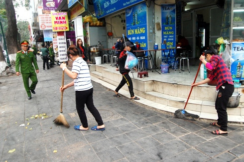 Cùng làm nhiệm vụ với CSTT, TTGT còn có cán bộ môi trường, y tế của phường, quận Hoàn Kiếm, yêu cầu các hộ kinh doanh gây mất vệ sinh môi trường phải thu dọn sạch sẽ