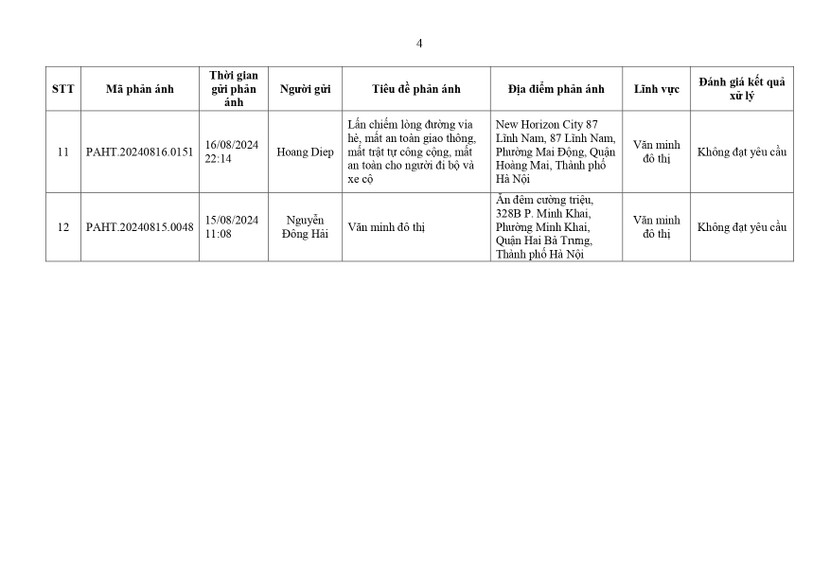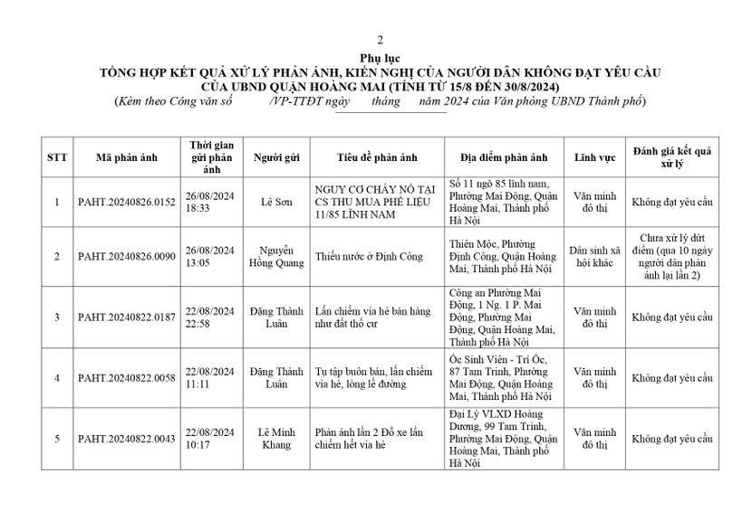 Văn phòng UBND TP vừa có văn bản thông báo đến UBND quận Hoàng Mai về việc giải quyết kết quả giải quyết phản ánh, kiến nghị chưa đạt yêu cầu.