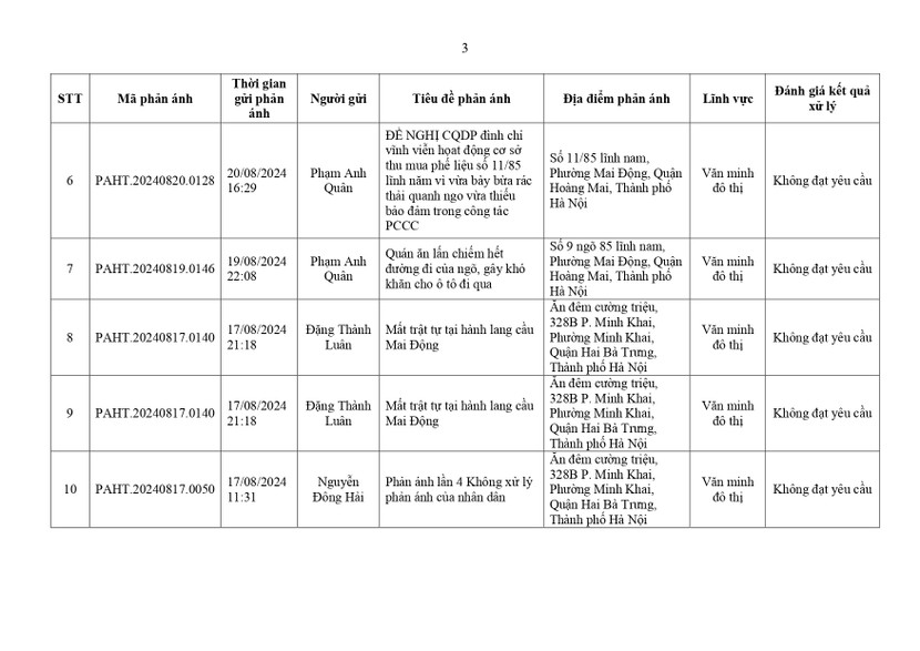 Văn phòng UBND TP đề nghị Chủ tịch UBND quận Hoàng Mai phối hợp thực hiện như sau: Chỉ đạo các cơ quan kiểm tra việc tiếp nhận, xử lý đối với 12 PAKN của người dân tại các phường: Mai Động, Định Công, Minh Khai (chi tiết theo Phụ lục gửi kèm); gửi kết quả về Văn phòng UBND TP trước ngày 06/9/2024 để tổng hợp, báo cáo UBND Thành phố theo quy định;