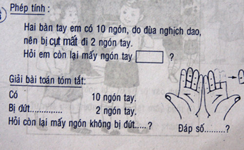 Hay như trong 1 cuốn sách bài tập toán dành cho học sinh Tiểu học, có ví dụ như thế này: “Hai bàn tay em có 10 ngón, do đùa nghịch dao nên bị cụt mất đi hai ngón tay. Hỏi em còn lại mấy ngón tay?”. Không những thế, sách bài tập toán còn có phần hướng dẫn giải tóm tắt và hình vẽ minh họa với hai bàn tay và hai ngón trỏ, giữa của bàn tay phải bị cắt rời bỏ sang một bên. Dù các bên liên quan là Nhà xuất bản Trẻ (đơn vị được in logo lên sách) và tác giả đều không nhận trách nhiệm về cuốn sách, song rõ ràng để một cuốn sách với mục tiêu giáo dục nhưng có những nội dung như vậy xuất hiện trên thị trường có thể thấy khâu xuất bản và quản lý hoạt động xuất bản còn quá nhiều lỗ hổng.