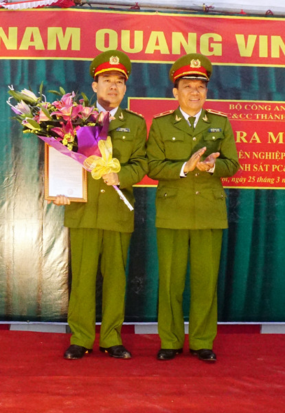 Thiếu tướng Nguyễn Đức Nghi, Giám đốc CS PC&CC TP Hà Nội trao quyết định ra mắt Đội Chữa cháy chuyên nghiệp Nam Từ Liêm cho lãnh đạo phòng CS PC&CC số 3 - Cầu Giấy