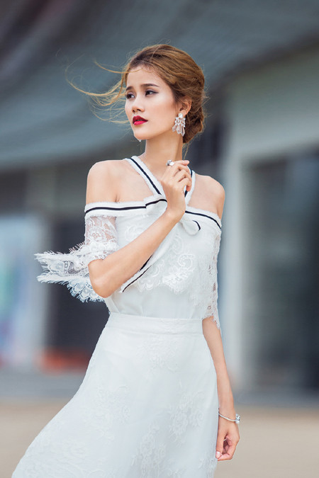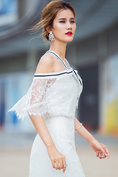 Những item mà cô ưu tiên lựa chọn là những trang phục ren trắng nhưng được thiết kế bằng kết cấu hiện đại, phù hợp cho mọi hoàn cảnh. Bên cạnh đó cô nàng cũng là tín đồ của mốt quần loe, vừa khéo léo kheo chân dài vừa mang đến vẻ ngọt ngào ngây ngất.